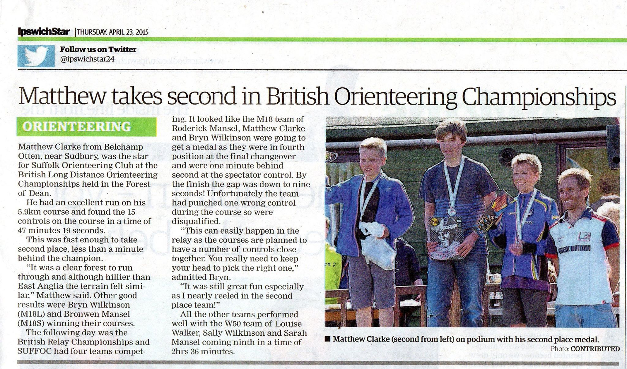 Congratulations to Matthew on his Silver medal in the M14 class at the British Long Distance Championships at New Beechenhurst and Brierley in the Forest of Dean on Saturday. Matthew (and other SuffOC competitors) have also featured in the Ipswich Star - read the account here.